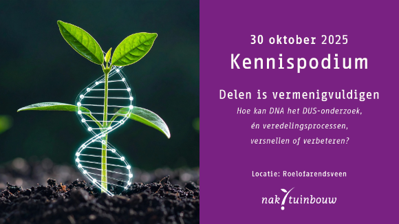 | Delen is vermenigvuldigen: hoe kan DNA het DUS-onderzoek, én veredelingsprocessen, versnellen of verbeteren? Naktuinbouw organiseert een Kennispodium op donderdagmiddag 30 oktober. Diverse sprekers delen hun visie op de toekomst van rassenonderzoek en identiteitsbepaling met DNA. Zet de datum alvast in uw agenda. |